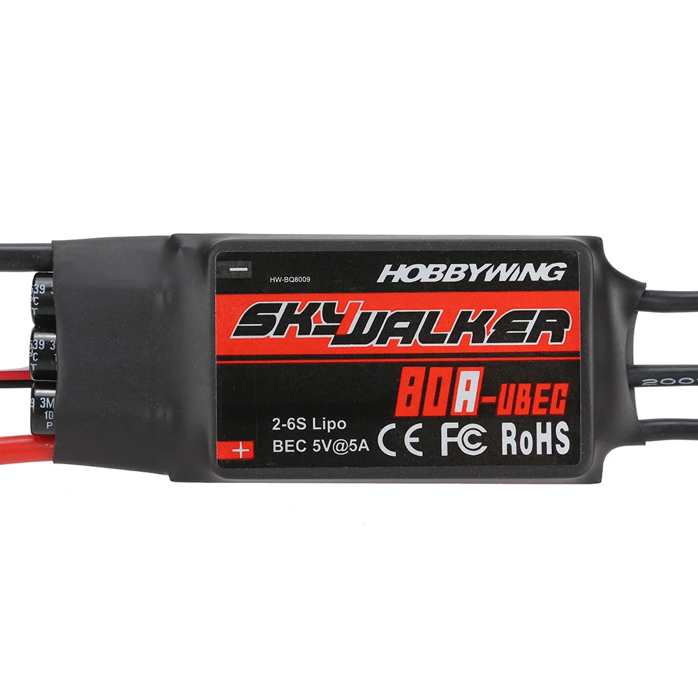 ESC Hobbywing Skywalker 80A идеально подходит для широкого спектра моделей, от гоночных самолетов до квадрокоптеров, и является надежным выбором для любителей и профессионалов. Он сочетает в себе передовые технологии и удобство использования, обеспечивая высокую производительность и долговечность.