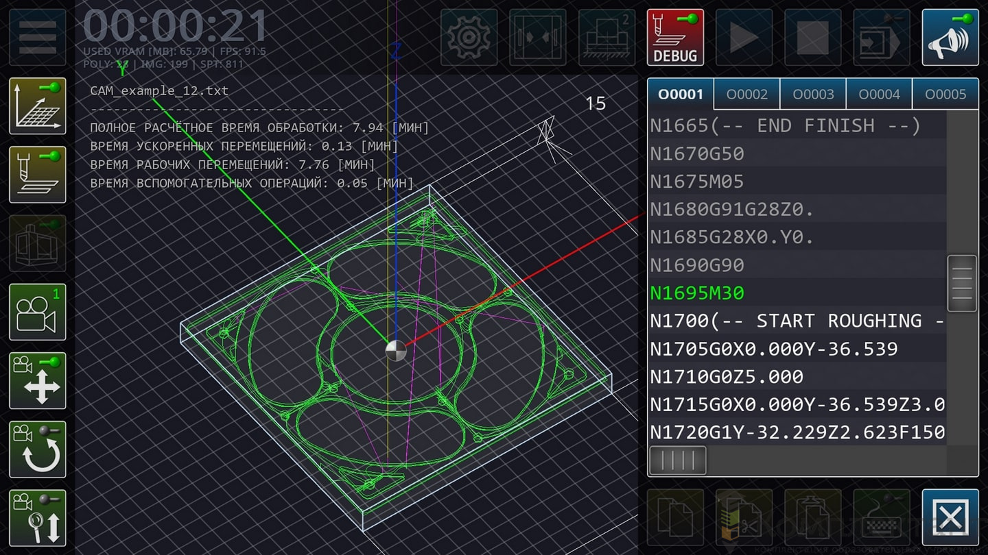 Имитационное обучение принципам программирования операций фрезерной обработки на станке с ЧПУ, синтаксический анализ (парсинг) кода управляющих программ с целью построения графической модели траекторий режущего инструмента в трёхмерном пространстве.