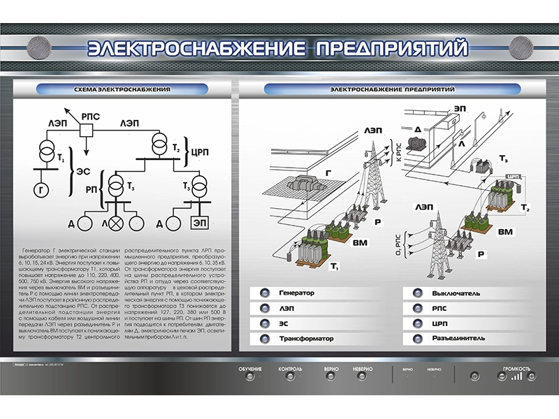 Электрифицированный стенд представляет собой полноцветную панель с раздельной светодиодной индикацией, отображающей информацию по основам электроснабжения предприятий и их устройство. В конструкцию учебного оборудования интегрированы высокочувствительные сенсоры для управления стендом при помощи интерактивного воздействия приемо-передающих устройств. Оборудование оснащено программным обеспечением "Виртуальный инструктор", громкость которого изменяется при помощи сенсорного регулятора, расположенного на лицевой панели.