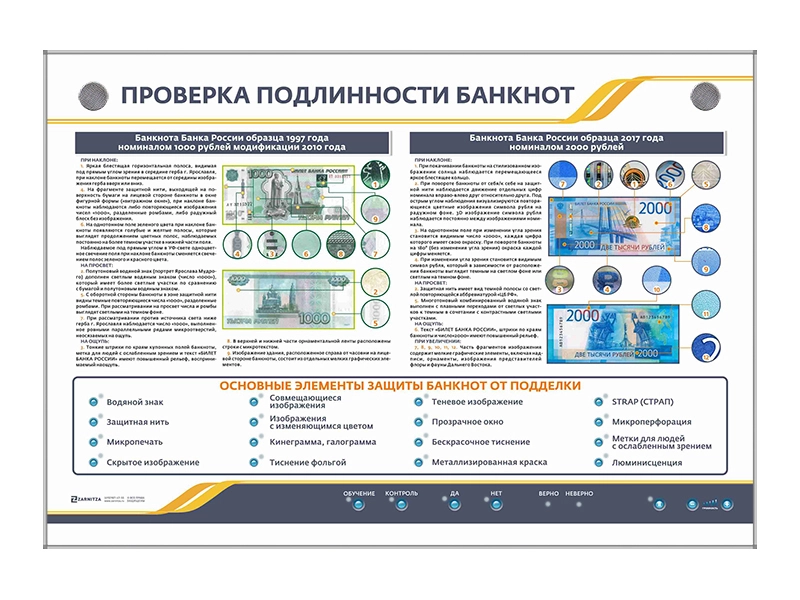 Интерактивный электрифицированный стенд " Проверка подлинности банкнот " представляет собой полноцветную панель с раздельной световой индикацией, на которой представлена информация об основных методах защиты и проверки подлинности банкнот. В конструкции учебного оборудования интегрированы высокочувствительные сенсоры для управления стендом при помощи интерактивного воздействия приемо-передающих устройств. Предусмотрено два режима работы со стендом: "Обучение" и "Контроль".