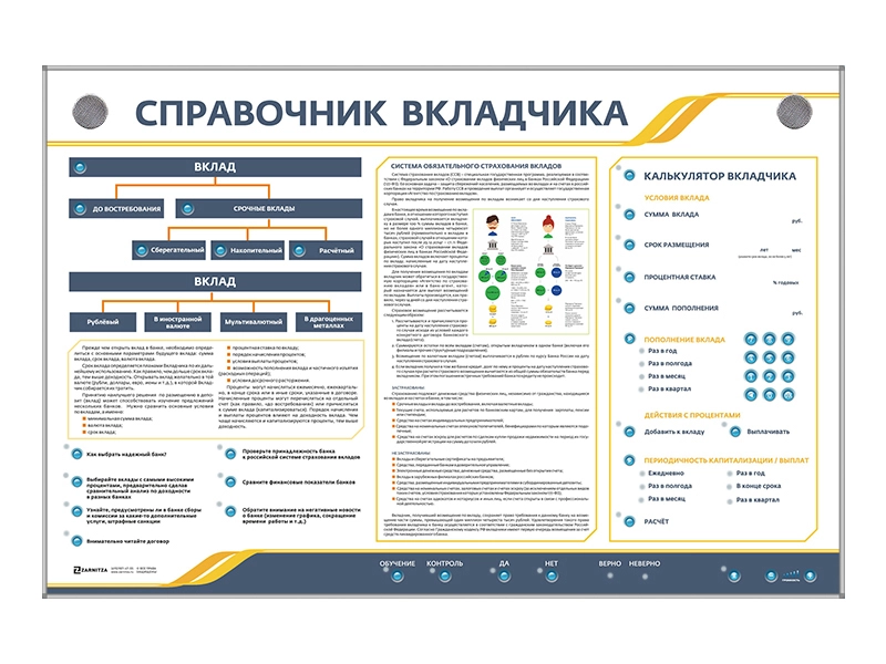 Интерактивный электрифицированный стенд "Справочник вкладчика" представляет собой полноцветную панель с раздельной световой индикацией, где представлена информация о банковских вкладах, их разновидностях и системе обязательного страхования. В конструкции учебного оборудования интегрированы высокочувствительные сенсоры для управления стендом при помощи интерактивного воздействия приемо-передающих устройств. Предусмотрено два режима работы со стендом: "Обучение" и "Контроль".