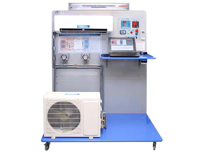 Комплект представляет собой изделие напольного исполнения. На специализированном основании, оснащенном колесными опорами, размещена действующая сплит-система, состоящая из наружного и внутреннего блоков, оснащенная комплектом датчиков и измерителей для регистрации параметров работы установки в различных режимах. Специализированное программное обеспечение позволяет регистрировать значения с датчиков температуры, расположенных в различных точках сплит-системы, в режиме реального времени, сохранять данные для дальнейшей обработки, управлять вводом неисправностей, обеспечивает построение циклов холодильной машины в T-s диаграмме и P-h диаграмме.