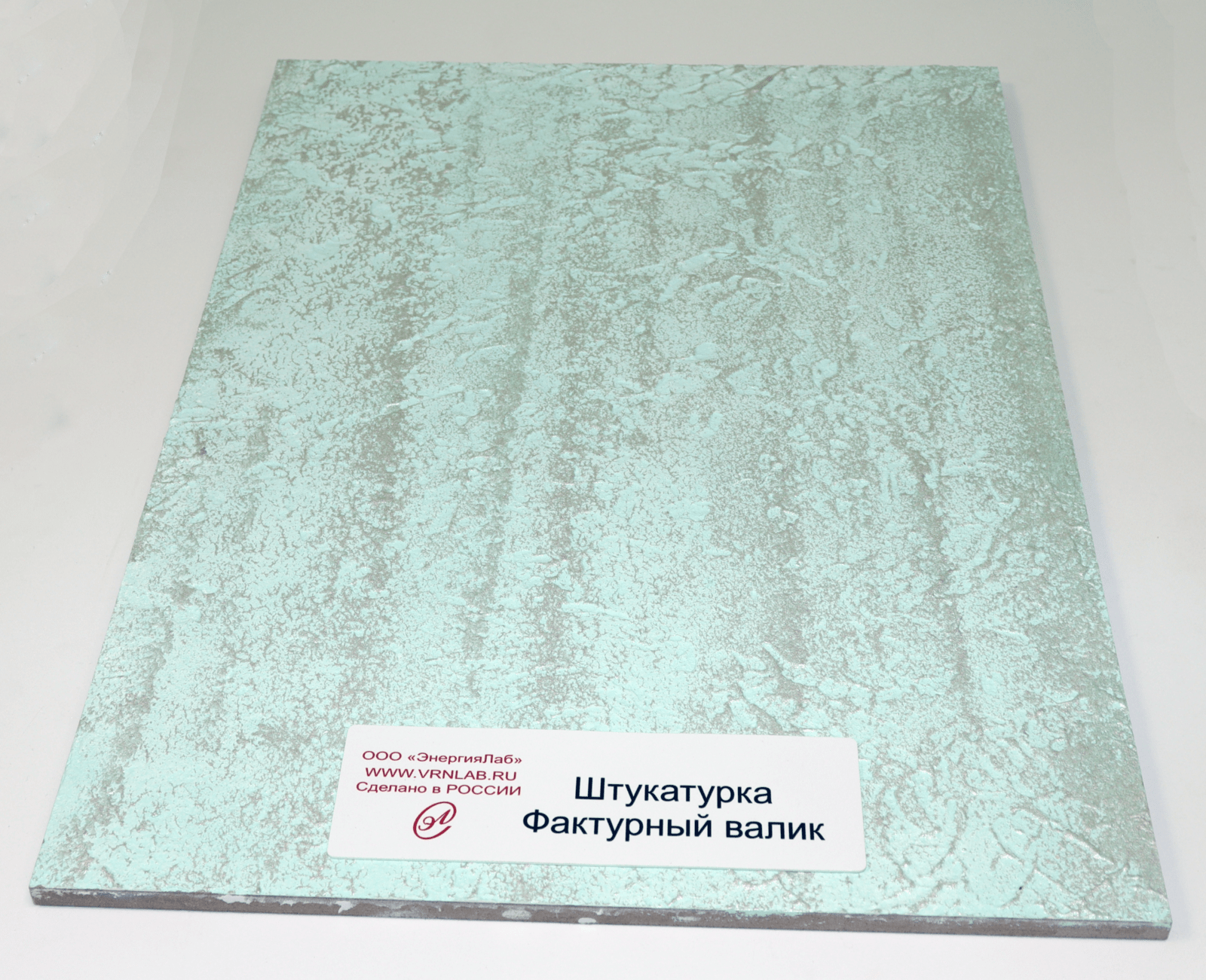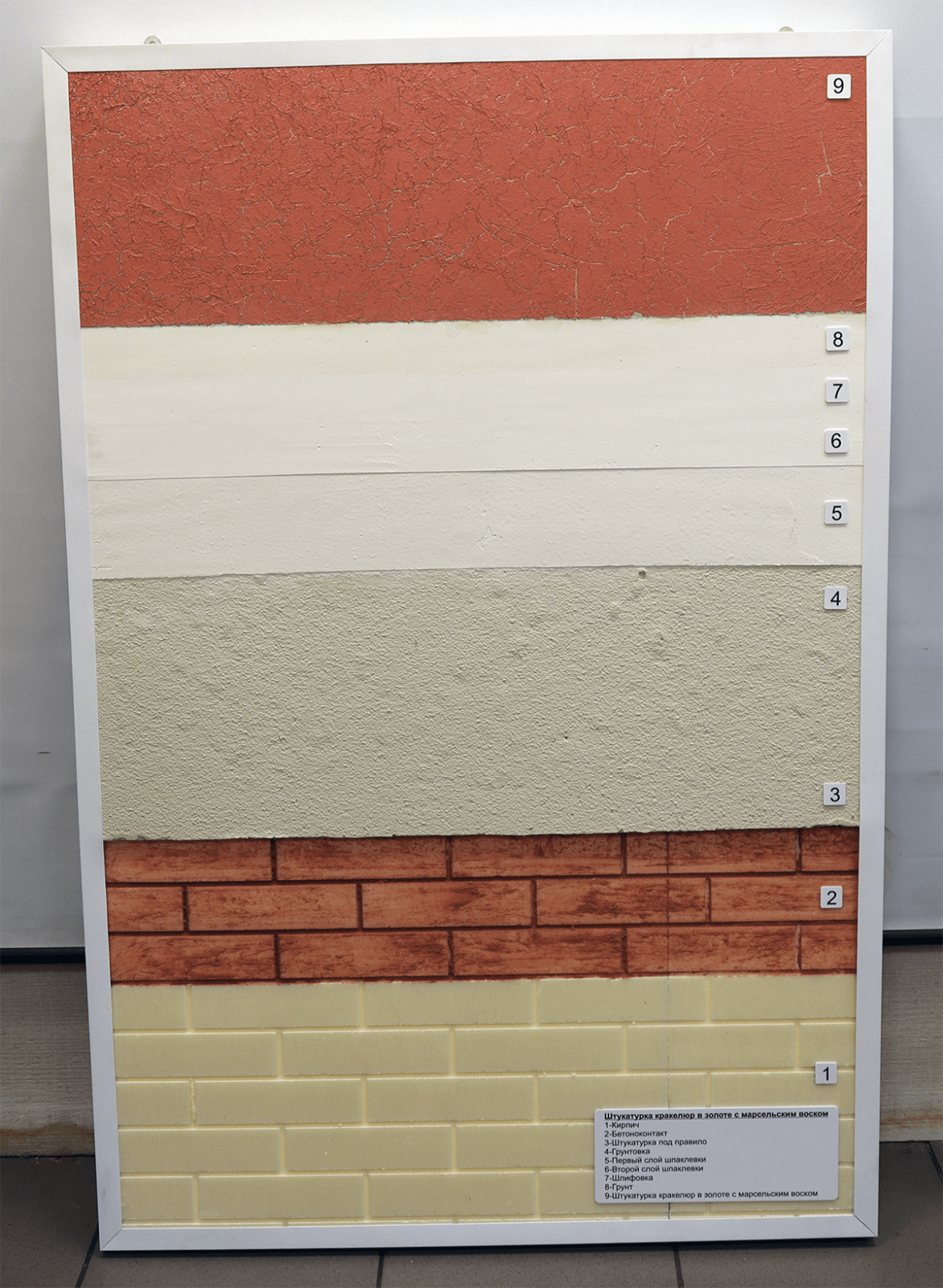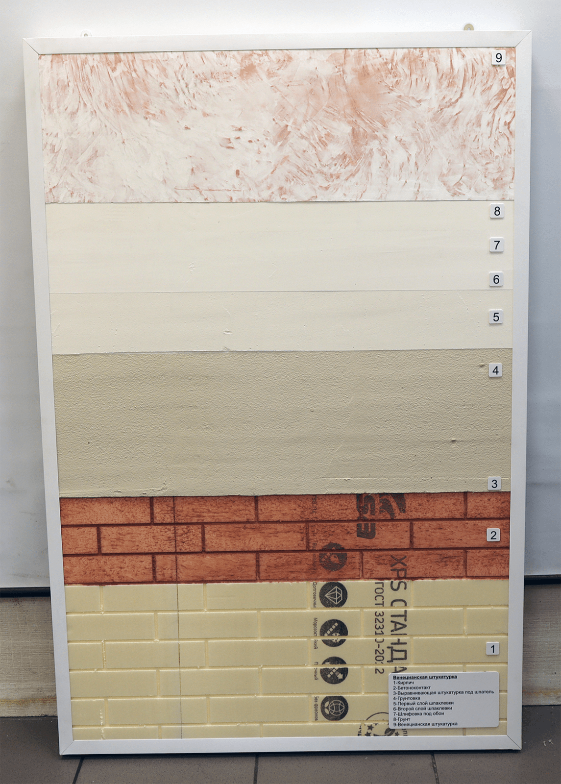 - Образец штукатурки нанесен на деревянную табличку, закрепленную на композитной панели.