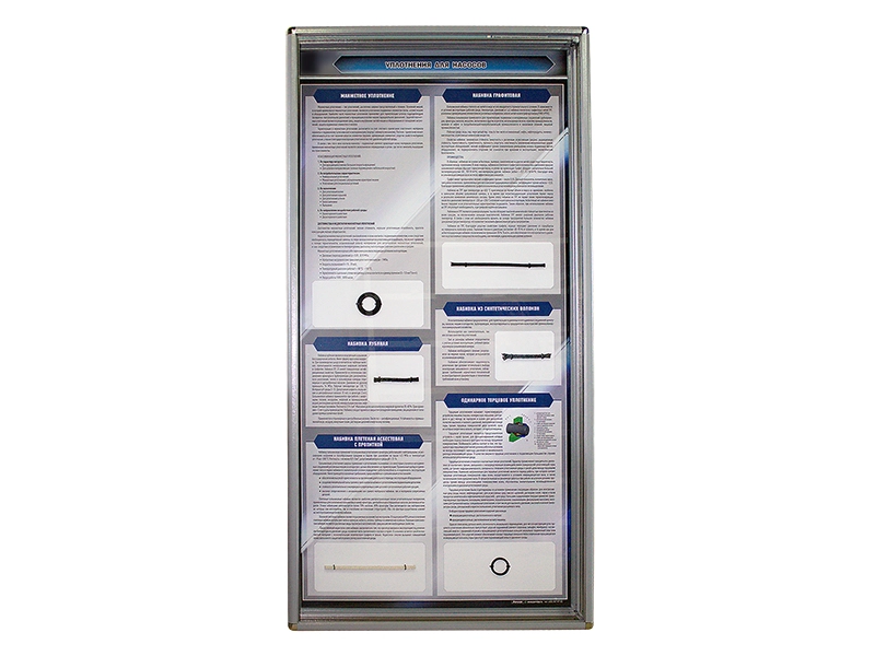 Комплект наглядно-демонстрационного оборудованияпредставляет собой информационную панель с размещенным на ней набором уплотнений для насосов, закрытую защитной панелью из оргстекла.