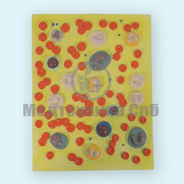 Данная модель демонстрирует разнообразные типы клеток крови, включая эритроциты и лейкоциты (лимфоциты, моноциты, нейтрофилы, эозинофилы и базофилы) и тромбоциты.