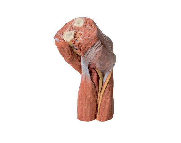 При рассмотрении с передней стороны наиболее очевидной особенностью является наличие двуглавой мышцы плеча, со вставкой в виде уплощенного двуглавого апоневроза, проходящего медиально над мышцами общего сгибателя, более округлое сухожилие, проходящее глубоко, для проникновения в лучевую бугристость. Мышца плечевого пояса лежит глубже двуглавой мышцы плеча и видна с боковой стороны. В проксимальной части предплечья можно выделить мышцу плечевого пояса (слегка приподнятую и отраженную в боковом направлении, чтобы выявить более глубокие структуры) и разгибатель carpi radialis longus. На медиальной стороне можно увидеть классическое расположение сухожилия двуглавой мышцы плеча, плечевой артерии и срединного нерва от латерального к медиальному. Они частично покрыты двуглавым апоневрозом, поскольку они распространяются дистально. Можно увидеть изменение локтевого нерва, меняющего положение от переднего отсека руки к заднему отделу (межмышечная перегородка не сохранилась, но мышцы трицепса четко видны), возможно пройти позади медиального эпикондила и войти в кубитальный туннель. Он проходит дистально между двумя головками мышцы-сгибателя. При тщательном осмотре канавки между плечевым и лучеплечевым поясом выявляется лучевой нерв (который не был бы виден, если бы мышца плечевого пояса не была частично отражена). Он лежит среди жира (желтого цвета), но его поверхностная ветвь проходит дистально ниже плечевого отдела. С заднего ракурса сухожилие трицепса вставляется в локтевой отросток локтевой кости. Медиальный и латеральный эпикондили также хорошо видны (серый / белый в окраске). Медиальный надмыщелок является четко идентифицируемым, так как он имеет локтевой нерв, проходящий сзади, до попадания в глубокую фасцию, покрывающую щель между двумя головками сгибателя локтевого отростка запястья.