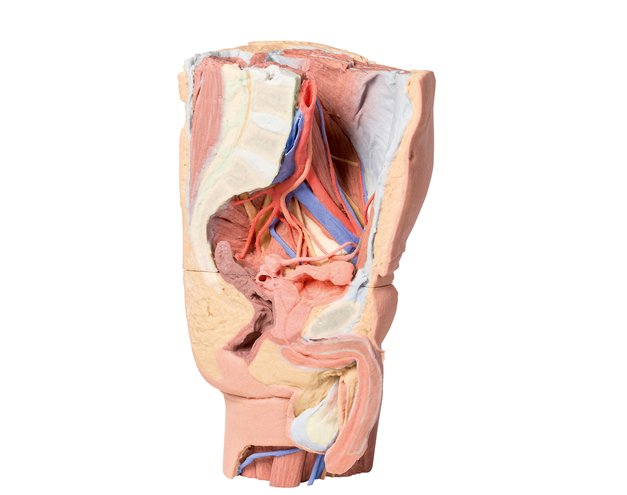 По средней линии видны лобковый симфиз и сагиттальные отделы тазовых внутренних органов: от переднего к заднему, мочевой пузырь (левый мочеточник, который проходит над подвздошными сосудами на уровне краев таза), левые семенные пузырьки и сосудистые пузырьки семявыносящий проток и прямая кишка (с окружающей внешней мышцей анального сфинктера). Путь мочеиспускательного канала виден от нижнего полюса мочевого пузыря через предстательную железу, тазовую диафрагму и губчатое тело полового члена. Ниже эректильных органов в срезе (corpus cavernosa и corpus spongiosum) находится мошонка, где была удалена кожа для демонстрации париетальной туники влагалища.