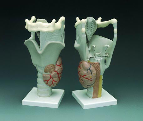 Модель (с увеличением примерно в 2,5 раза) включает подвижный надгортанный хрящ, голосовые связки и хрящ. Модель на подставке, неразъемная, размер 14х14х28 см.