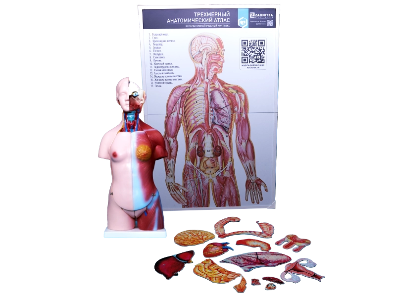 Торс человека представлен реалистичной анатомической моделью с основными антропометрическими и топографическими характеристиками. Отдельные внутренние органы могут извлекаться и использоваться в качестве наглядного пособия.