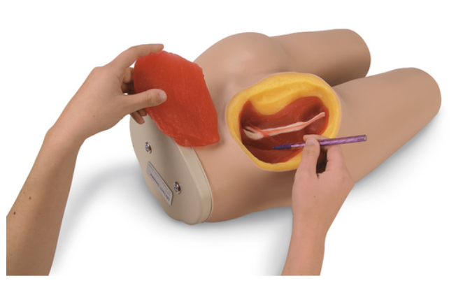 Симулятор постановки внутримышечных инъекций подходит для обучения студентов в классной комнате или практических занятий групп любого размера, позволяя приобрести как визуальный, так и тактильный опыт. В туловище располагаются костные структуры, а именно, верхняя часть бедренной кости — большой вертел, задняя верхняя и передняя верхняя ости подвздошной кости и крестец. Костные структуры представляют собой пальпируемые анатомические ориентиры, которые позволяют студентам определить правильный участок для инъекции. Часть кожи верхнего внешнего квадранта ягодицы слева вырезана, что позволяет студентам рассмотреть подлежащие структуры. Хорошо видны средняя и большая ягодичные мышцы, седалищный нерв и сосудистые образования. Этот симулятор позволяет изучить и отработать три вида внутримышечных инъекций: дорзо-ягодичные инъекции, вентро-ягодичные инъекции и инъекции в латеральную широкую мышцу бедра. Подобно иным копиям и тренажерам, симулятор для выполнения внутримышечных инъекций очень реалистичен. Кожа и мышечная ткань, а также форма и положение костных структур полностью соответствуют анатомии живого человека. В результате при перфорации тканей тренажера иглой возникают такие же ощущения, как при выполнении инъекции настоящему пациенту. Поставляется в комплекте с учебным пособием, комплектом шприцев и твердым футляром для переноски.