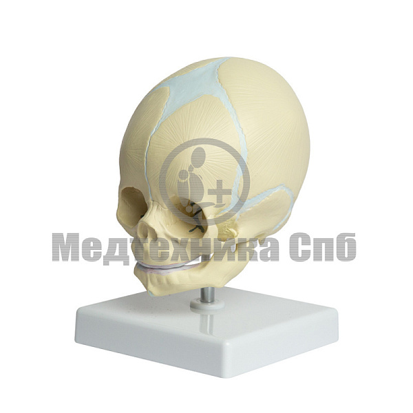 На модели представлены кости черепа новорожденного, швы и роднички. Нижняя челюсть подвижна. Модель состоит из двух лобных, двух теменных, двух височных, одной затылочной, клиновидной и решетчатой костей.
