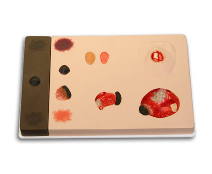 Тренажер определения стадии пролежней оживляет процесс ухода за раной так, как не смогли бы и лучшие фотографы. На модели представлены следующие виды пролежней: стадия 1 (в вариантах с темной и светлой пигментацией кожи), стадия 2, стадия 3 с нависающими краями, туннелизацией и отторгающимися некротическими массами, неглубокая стадия 4 над лодыжкой с обнаженной костью и сухожилием, а также рана со струпом/отторгающимися некротическими массами неустановленной стадии. Участок с темной пигментированной кожей демонстрирует, насколько по‑разному на стадии 1 могут выглядеть геморрагические пузырьки и пролежни глубоколежащих тканей в зависимости от пигментации кожи.