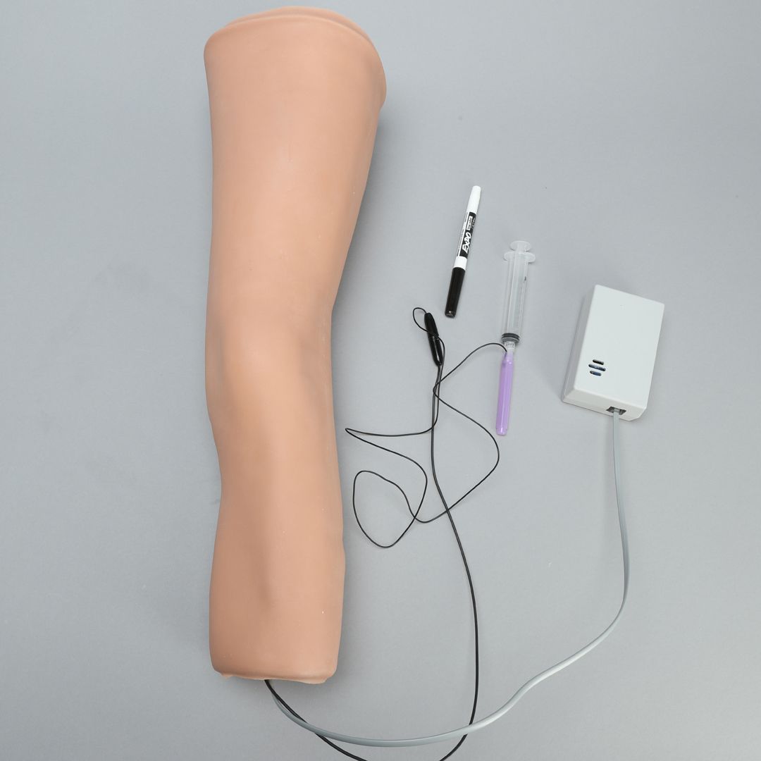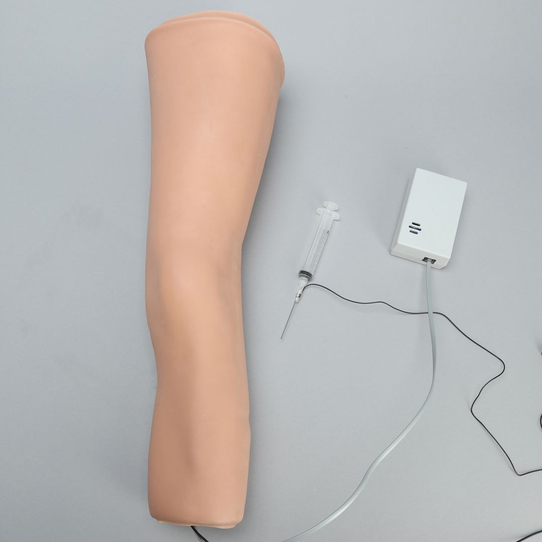 Тренажер для отработки навыков инъекций в коленый сустав обладает проводящей системой, которая дает звуковую обратную связь, когда игла касается определенной внутренней структуры.