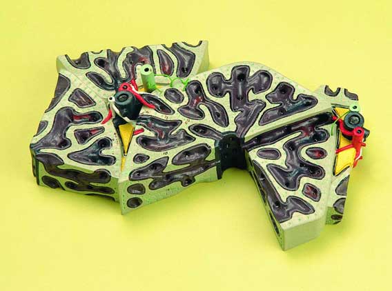 Эта значительно увеличенная модель демонстрирует мельчайшие детали одной дольки печени в разрезе, которая показана относительно частей окружающих долек. С помощью окрашивания выделены воротные вены и сосуды, венозные синусоиды и центральные вены с разрезами желчных каналов. С ключами. 25x15x6 см.