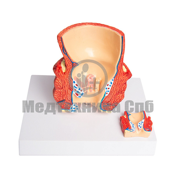На модели представлены фронтальный разрез прямой кишки человека и рельефное изображение прямой кишки меньшего размера.