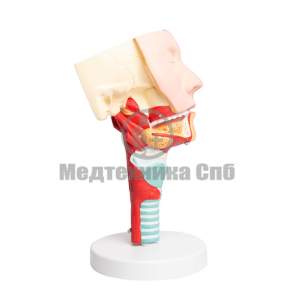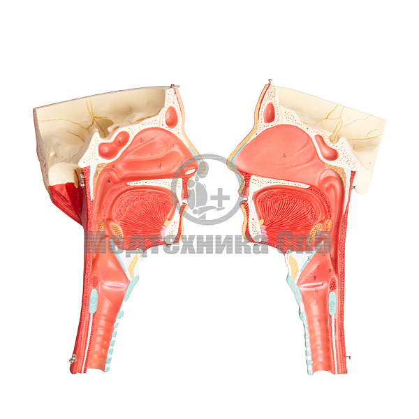 На модели наглядно представлено анатомическое строение глотки; носовой и ротовой полостей, гортани. Показаны мышцы и железы.