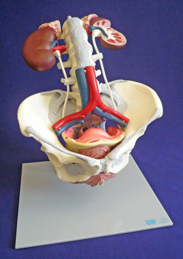 Полноразмерная модель таза с пятью поясничными позвонками со связками, тазовым дном, мочеполовыми органами, почками, мочеточниками и брюшной аортой. Располагается на подставке. 44x30x20 см.
