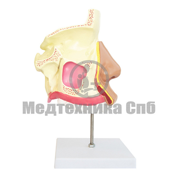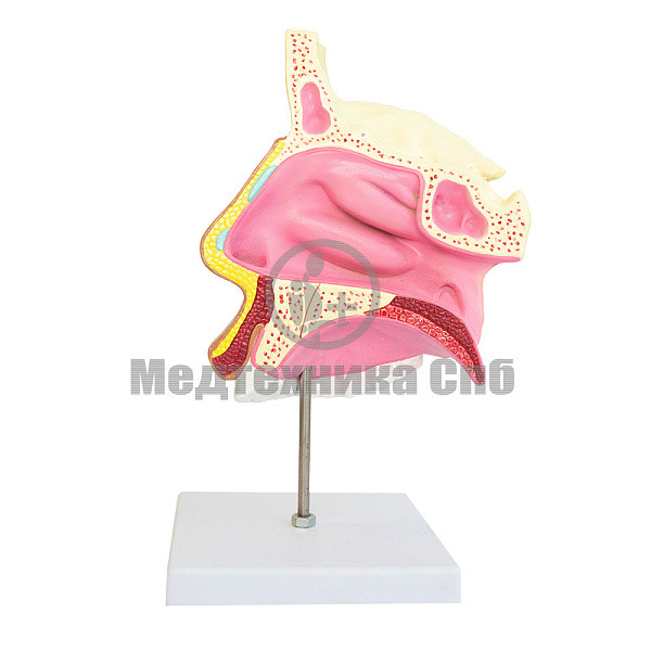 Модель позволяет детально рассмотреть анатомическое строение полости носа, включая наружный нос, носовую полость, а также артерии, нервы и остиомеатальный комплекс.