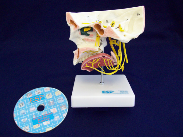 Уникальная модель, предназначенная именно для помощи в понимании пяти особых органов чувств — зрения, обоняния, вкуса, слуха, равновесия — и связанных с ними нервов. Полноразмерный череп со съемным глазом и языком в разрезе. Отделы черепа делятся на части, чтобы продемонстрировать каждый важный нерв. Тройничный нерв гибкий, что позволяет показать нижележащий каменистый нерв. Указаны входящие в состав кости. Модель поставляется с 18-минутной лекцией, записанной на компакт-диске, и с карточкой с ключами. 19x15x15 см.