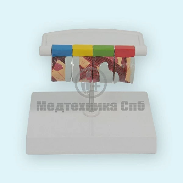 Модель разработана как демонстрационный материал для средних и высших медицинских учебных заведений, а также для демонстрации пациентам во врачебных кабинетах. Изготовлена из поливинилхлорида (ПВХ), легко закрепляется на подставке и снимается с неё.