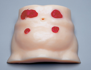 Изготовленная из прочного материала эта тренировочная модель с бежевым оттенком кожи содержит четыре стомы: временную колостому с двойной петлей, свежую трансверзостому, нисходящую колостому и илеостому. Илеостому можно использовать для установки мешка, и все четыре стомы можно оросить катетером, промыть и перевязать. Поставляется с лубрикантом, простыней и переносным чехлом размером 30,5 х 22,8 х 12,7 см.
