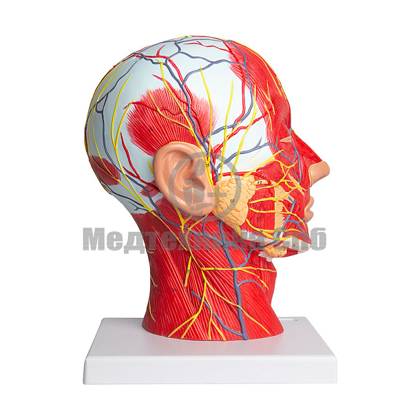 Модель половины головы с мышцами лица и поверхностными сосудами и нервами (арт. P1631)