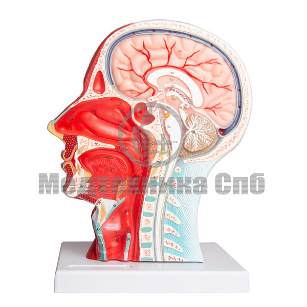 Поверхностный срез позволяет увидеть мышцы лица, поверхностные кровеносные сосуды и нервы лица и скальпа, околоушную и подчелюстную железы. Срединный разрез демонстрирует головной мозг с внутренними структурами, глотку и верхние дыхательные пути, срез шейных позвонков.