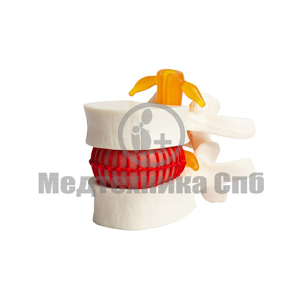 Состоит модель из двух поясничных позвонков со спинномозговыми нервами и эластичным межпозвоночным диском. На модели наглядно продемонстрирована протрузия межпозвоночного диска с латеральной и медиальной стороны, путем сдавливания двух позвонков между собой.
