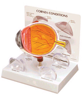 Эта увеличенная модель глаза включает 4 сменных муляжа роговицы, которые демонстрируют разные состояния роговицы, включая: буллезную кератопатию, эндотелиальную дистрофию Фукса, кератоконус и здоровую роговицу.