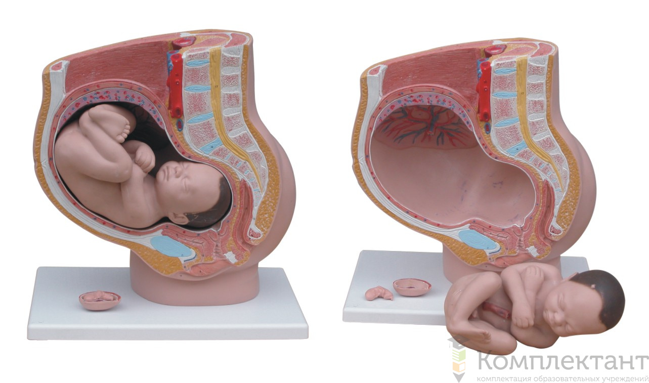 Модель закреплена на подставке, на которой рядом расположена модель беременной матки с эмбрионом в сроке около 12 недель.