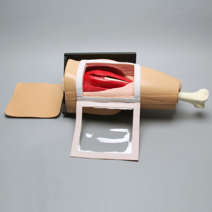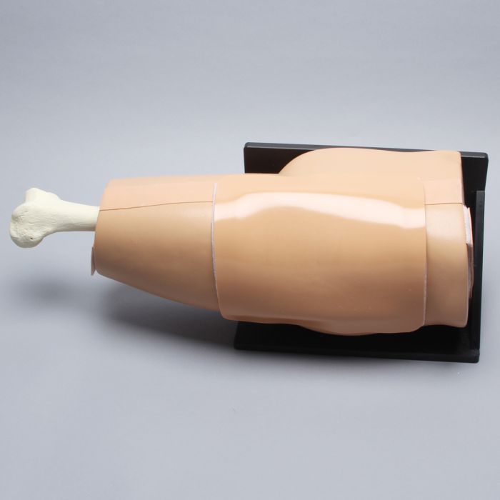 Модель тазобедренного сустава M.I.S. для многоразового применения со сменной тазобедренной вставкой, в которую входят модель половины таза (муж.) и бедренная кость, а также малая, средняя и большая ягодичная мышца, широкая фасция бедра, квадратная мышца бедра, грушевидная мышца, запирательная мышца бедра и соединенная задняя группа мышц. Данную модель можно использовать для проведения процедур M.I.S. с передним и латеральным доступом. Модель также включает в себя сменную непрозрачную накладку, сменный прозрачный лоскут кожи и настольные крепления.