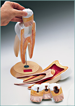 Четыре сменных вкладыша демонстрируют стадии развития кариеса. Это наша самая большая модель зуба, она изготовлена из прочного пластика и демонстрирует моляр верхней челюсти, увеличенный в 15 раз по сравнению с натуральной величиной, чтобы сделать обучение наглядным. Разделите моляр в продольном направлении, чтобы продемонстрировать его внутреннее строение от коронки до корня. Затем удалите пульпу с одной половины зуба. Затем извлеките часть с коронкой зуба из другой половины. Наконец вставьте любую из трех дополнительных сменных частей, на которых продемонстрированы стадии развития кариеса. Основные элементы модели, на которые номер нанесен вручную, указаны в прилагаемых ключах. Модель зуба располагается на деревянной подставке, и ее размеры составляют 18x18x33 см.