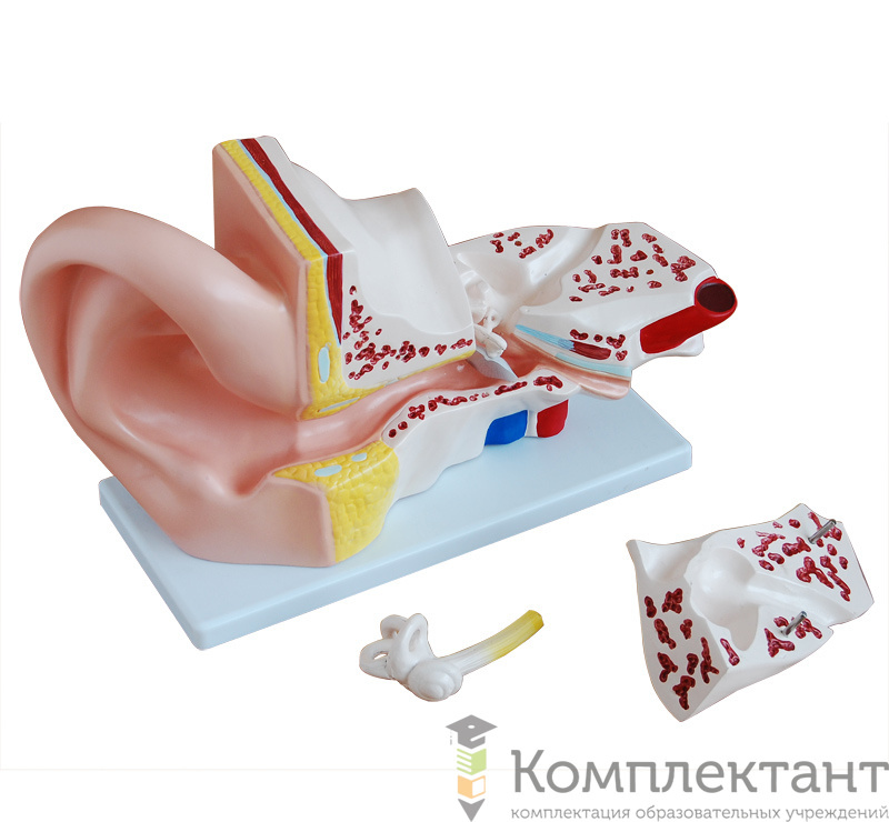 Модель демонстрирует три основные структурные части органа слуха (наружное ухо, среднее ухо, внутреннее ухо) и положение органа равновесия в организме человека.