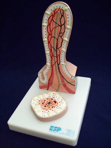 На этой значительно увеличенной модели, состоящей из двух частей, ворсинка тонкого кишечника показана в поперечном и продольном сечении. Располагается на подставке размером 17,5x15 см, с карточкой с ключами.