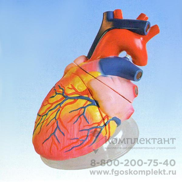 Модель, изготовленная из пластмассы, является разборной. Устанавливается на пластмассовую подставку. Высота изделия в сборе ≈ 40см. Модель раскрашена в естественные цвета и позволяет выявить следующие детали внешнего и внутреннего строения сердца человека: 1. Дуга аорты 7. Правый желудочек 2. Легочная артерия 8. Левое предсердие 3. Верхняя полая вена 9. Левый желудочек 4. Нижняя полая вена 10. Двустворчатый клапан 5. Венечные сосуды 11. Трехстворчатый клапан 6. Правое предсердие 12. Полулунные клапаны