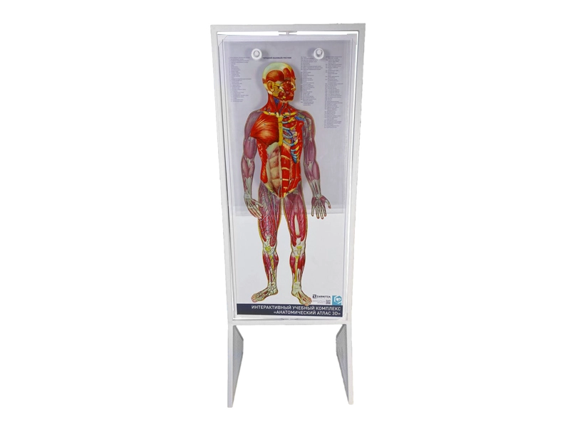 Стенд имеет вращающий механизм, с помощью которого есть возможность изучить вентральную часть с лицевой стороны и дорсальную со стороны спины анатомии человека. На стенде изображено строение тела человека с вскрытыми полостями. Продемонстрировано строение задних стенок грудной и брюшной полостей, отделов головного мозга на сагиттальном разрезе, также представлена костно-мышечная организация верхних и нижних конечностей. За счет светопроницаемости предусмотренных конструкцией четырех фолий при их последовательном наложении на панель создается послойное качественное изображение органов и разных систем тела человека, фрагментов нервной системы и кровоснабжения. На задней поверхности панели изображено строение скелета человека и периферической нервной системы.
