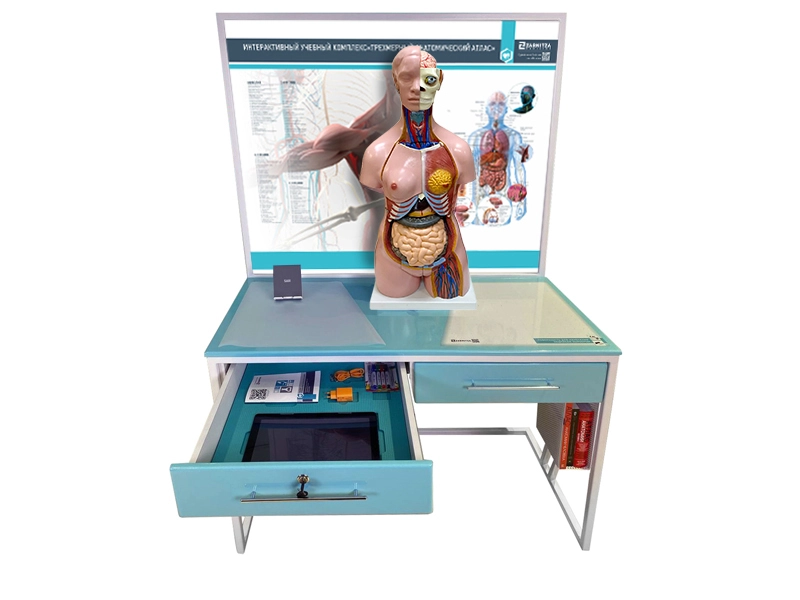 Функциональной частью трехмерного анатомического атласа является инновационная система с визуализацией органов человека (легкие, трахея, альвеолы, сердце и его клапаны, органы брюшной полости, медиальный срез сердца, кровеносная система). Для этого на тренажёре есть метка дополненной реальности.