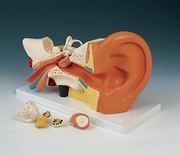 Модель представляют собой внешнее, среднее и внутреннее ухо. 3-кратное увеличение, 4 части. Съемная барабанная перепонка с молоточком и наковальней, а также лабиринт со стремечком, улиткой со слуховым и вестибулярным нервами. Поставляется на подставке.