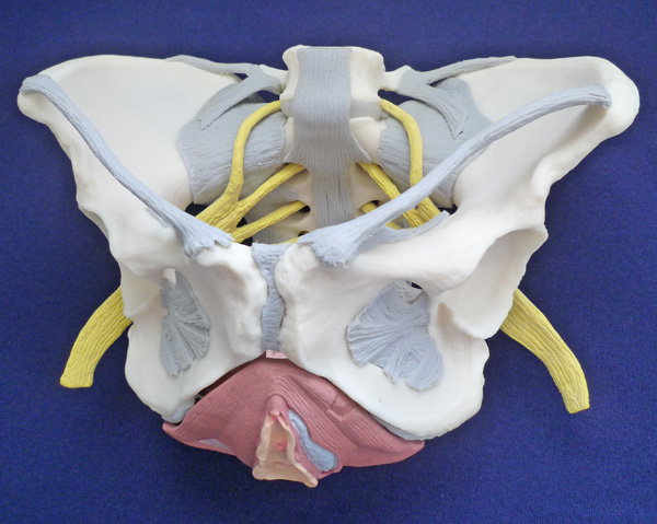 Полноразмерная модель женского таза из кости, демонстрирующая связки и основные нервы, со съемным тазовым дном, состоящим из 2 частей.