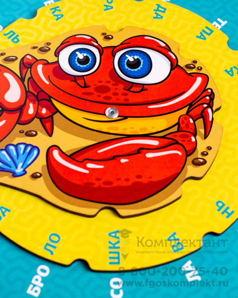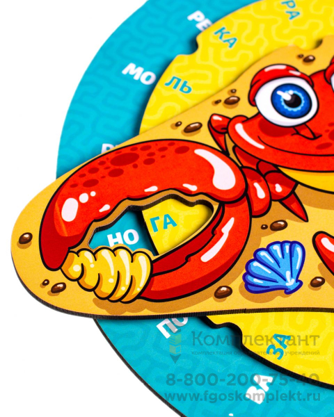Игра состоит из двух кругов разного диаметра и краба с отверстием в клешне. Каждый круг подвижен и разделен на сектора со слогами. Задача ребенка соединить слога на кругах так, чтобы получилось несколько вариантов слов для каждого слога. Развивает навыки чтения, внимание, память и мышление.